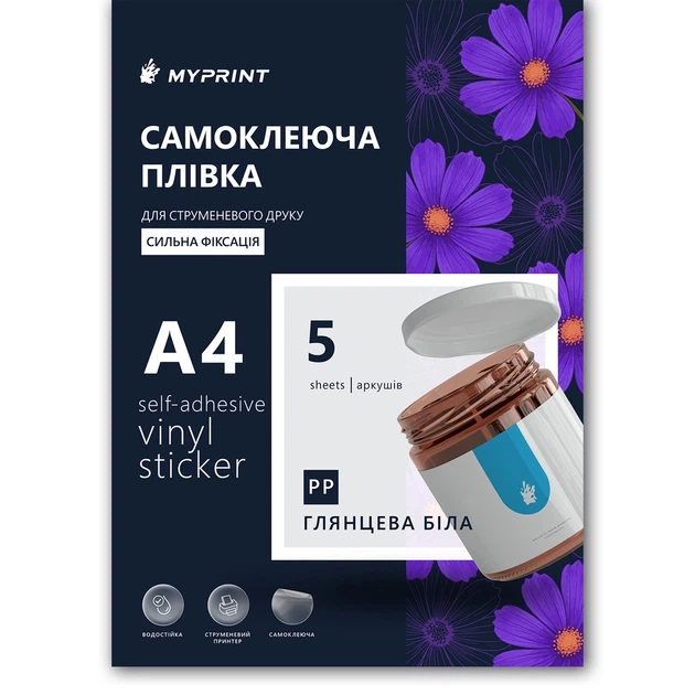 Самоклеюча плівка для струменевого друку My Print PP сильної фіксації водостійка, А4, 5 листів, глянцева біла (11314)