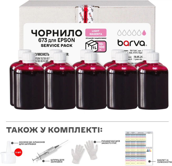 Комплект чорнила Barva для Epson 673 LM Water soluble Service Pack 10x100 мл Light Magenta (E-L800LM-1SP)