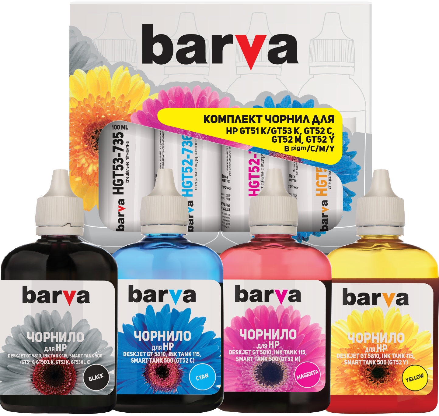 Комплект чорнил Barva HP GT51/GT52, GT/Ink Tank/Smart Tank, Black/Cyan/Magenta/Yellow, 4x100 мл чорнил (HGT53-100-MP) I-BARE