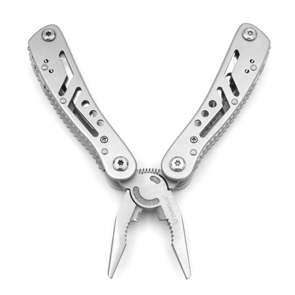 Размеры в походном положении - 110 мм; Материал рукояти - метал; Вес - 157 г. Функции: - нож (65 мм); - отвертка крестовая; - малая шлицевая отвертка; - лезвие для чистки луски; - инструмент для извлечения крючков; - открывалка для бутылок; - консервный нож; - инструмент для зачистки провода; - средняя шлицевая отвертка; - напильник; - большая шлицевая отвертка; - керн; - плоскогубцы; - кусачки.