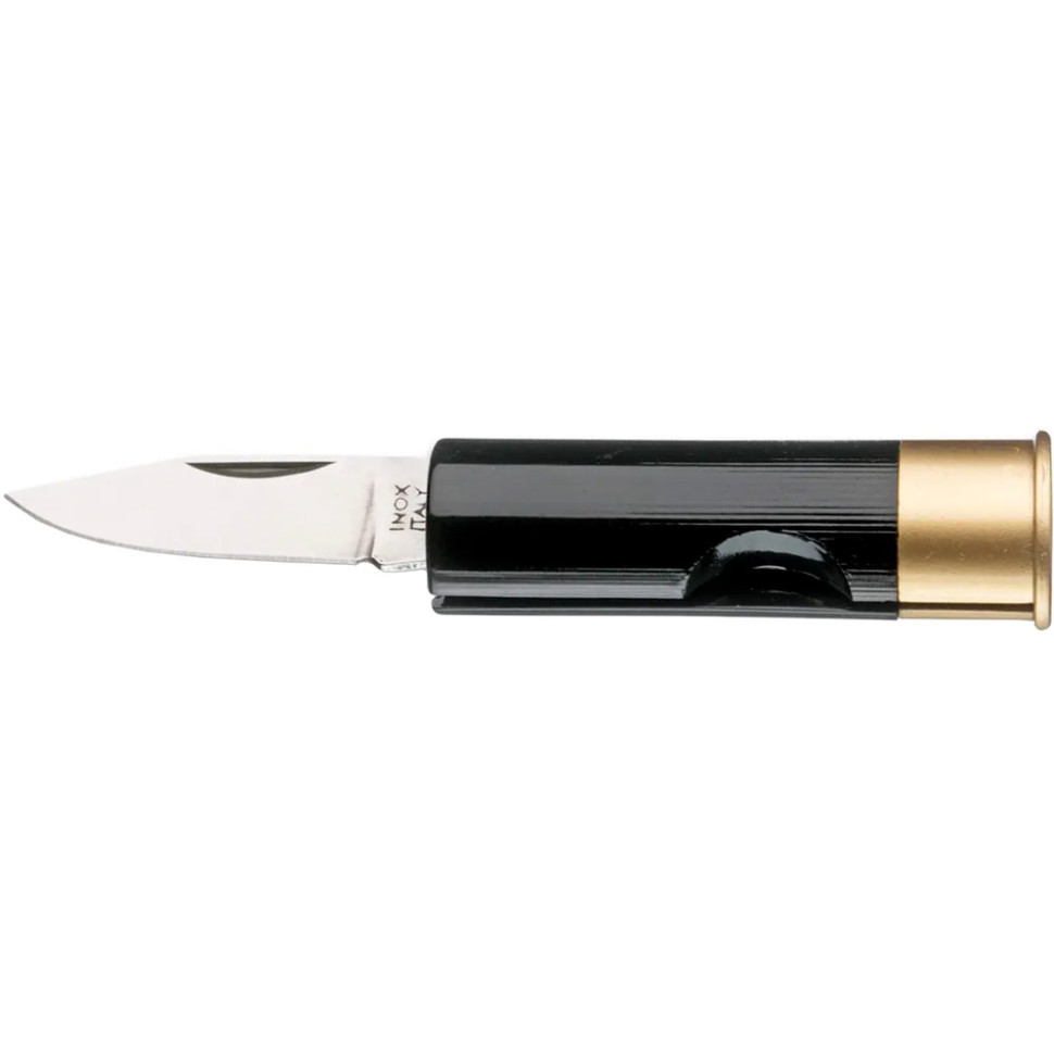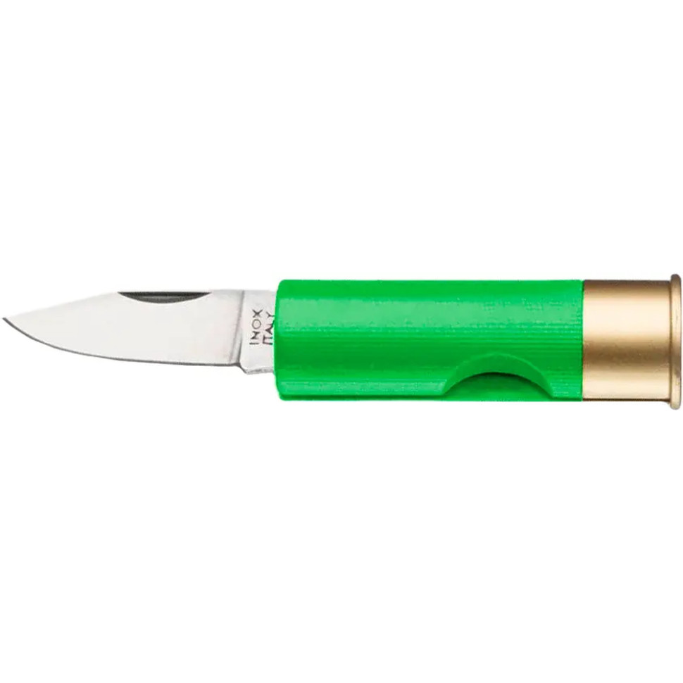 Cartridge Knife - це кишеньковий ніж, що виглядає як автентична гільза від дробовика 12-го калібру. Руків'я-корпус виготовлено з кольорового пластику (доступний в 5 кольорах: синій, жовтий, чорний, червоний і зелений), а невеликий клинок з нержавіючої сталі Aisi 420. Даний клинок хоч і не великий, але допоможе у розрізанні різноманітних пакувань, коробок, конвертів та навіть підійде для нарізання невеликих продуктів.