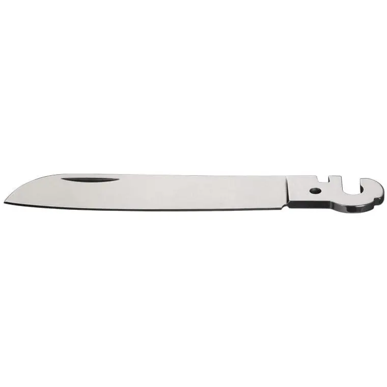 Змінний клинок з профілем Sheepsfoot має обух, який спускається по дузі в напрямку різальної кромки, що підвищує безпеку експлуатації леза. Комплектуюче виготовлено з нержавіючої сталі DIN 1.4116, яка надовго зберігає гостроту кромки. Розміри клинка становлять 2,1 х 85 х 15,8 мм при вазі 9,3 г.