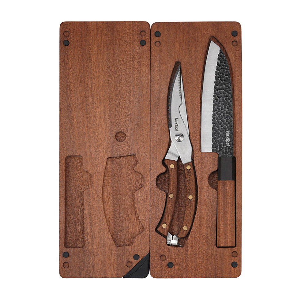 Преміальний набір NexTool Camp Chef складається з ножа Сантоку, ножиць та обробної дошки з магнітним з'єднанням. Інструменти виготовлені з нержавіючих марок сталі 30Cr13 та 30Cr14. Матеріал дошки: натуральна деревина Sapele. Є точило для догляду за лезами.