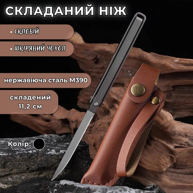 Складаний ніж із розбивачем скла та шкіряним чохлом SteelFolKnife, чорний