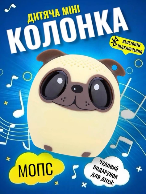 Дитяча портативна міні блютуз колонка ANIMAL мопс маленька бездротова акустична музична bluetooth акустика для дітей з функц