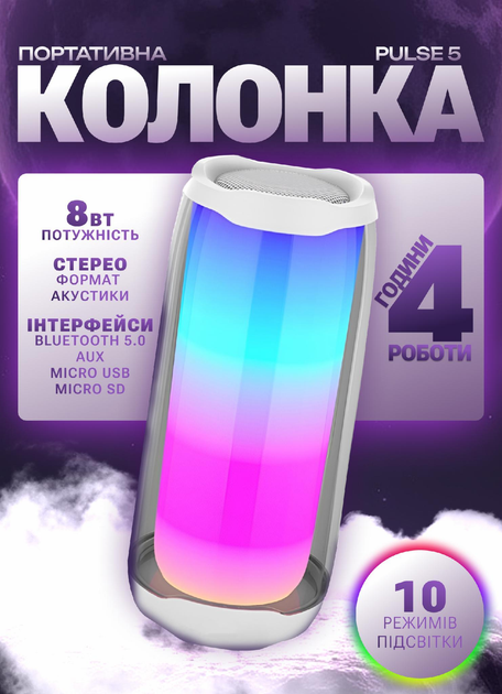 Портативна Bluetooth колонка Pulse 5 акумуляторна бездротова з підсвіткою та USB 8 Вт Білий BT/TF/FM/AUX/USB (PULSE5W)