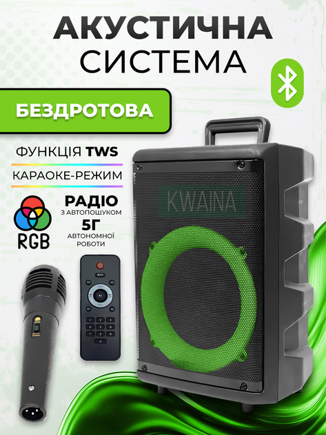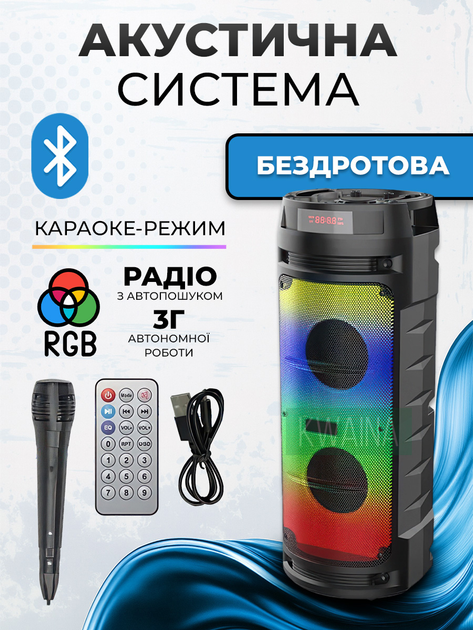 Портативна акустична система Bluetooth, 30Вт з мікрофоном, пультом, FM, USB, RGB LED-підсвічуванням, акумулятор 4500 mAh, ка