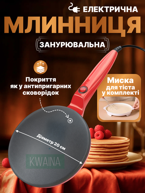 Погружна млинець електричний (20см) 600Вт, електромлинець з антипригарним покриттям від мережі, Червоний