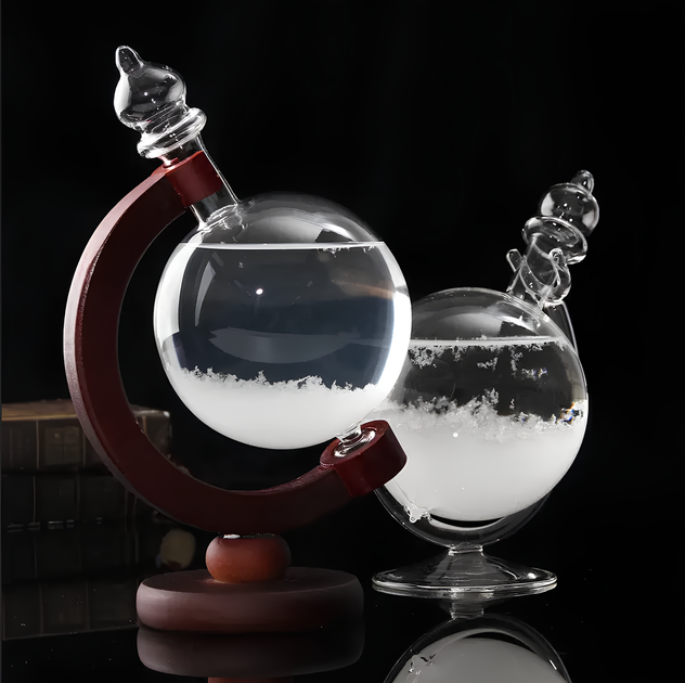 Барометр Штормгласс RESTEQ глобус великий, крапля Storm glass на темній дерев'яній підставці
