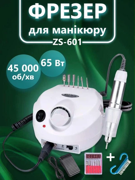 Фрезер (апарат) для манікюру ZS-601 65 Вт 45 000 об/хв Білий + Щітка манікюрна "праска" для видалення пилу мала
