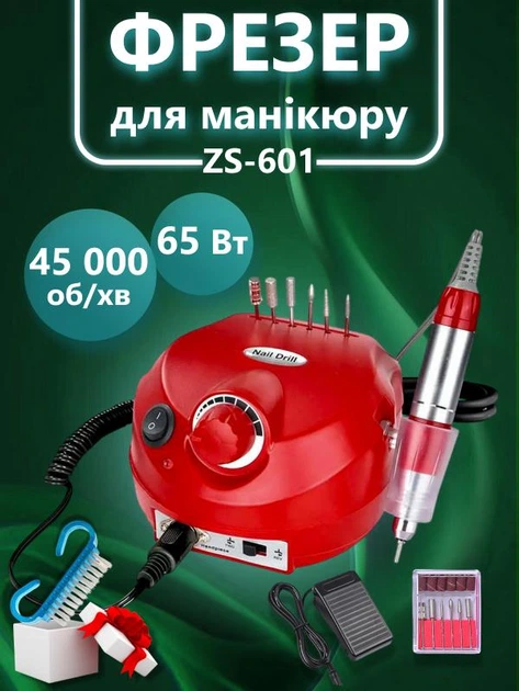 Фрезер (апарат) для манікюру ZS-601 65 Вт 45 000 об/хв Червоний + Щітка манікюрна "праска" для видалення пилу мала