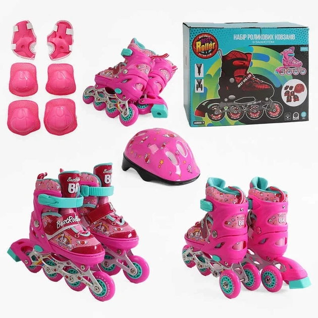 Дитячі ролики, розмір 35-38, із захистом і шоломом, з колесом, що світиться, у чохлі, Рожеві