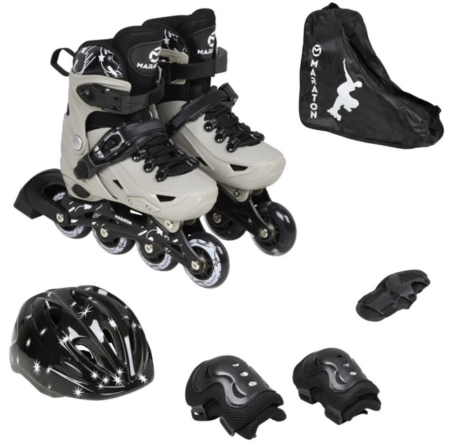 Розсувні ролики Maraton Vega з набором захисту та шоломом, колеса PU, переднє світиться, розмір 29-32.5, Сірі