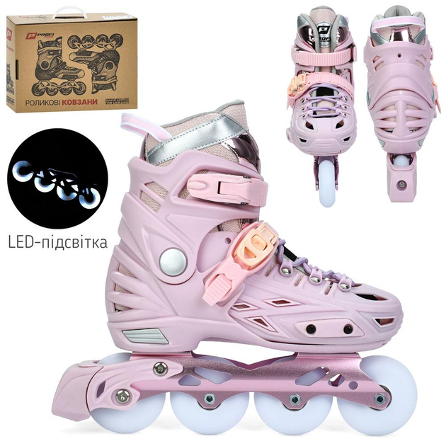 Ролики розсувні (39-42), алюмінієва рама, шнурівка+бакля, колеса PU 70мм, LED світло, устілка 24см, рожеві, у коробці (A4155