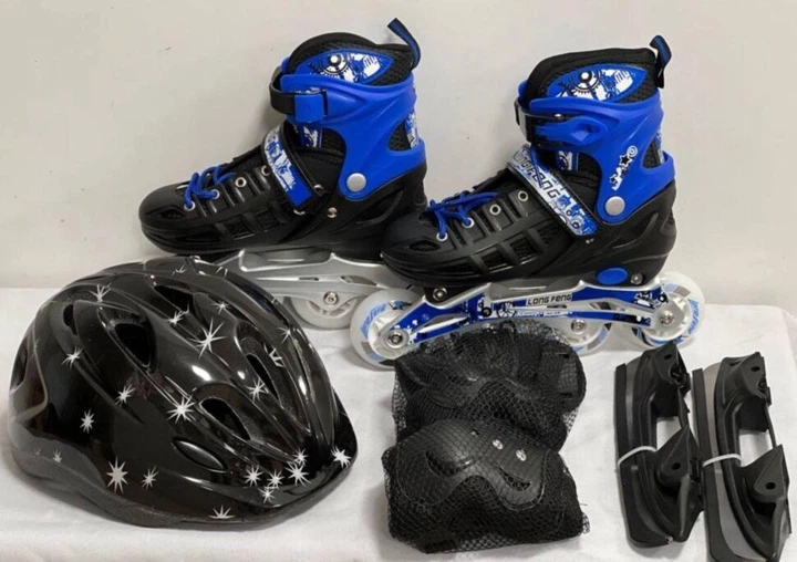 Набір дитячі розсувні ролики та ковзани для хлопчика/дівчата із захистом та шоломом чорно-сині Maraton 2в1 (Ice S (31-34))