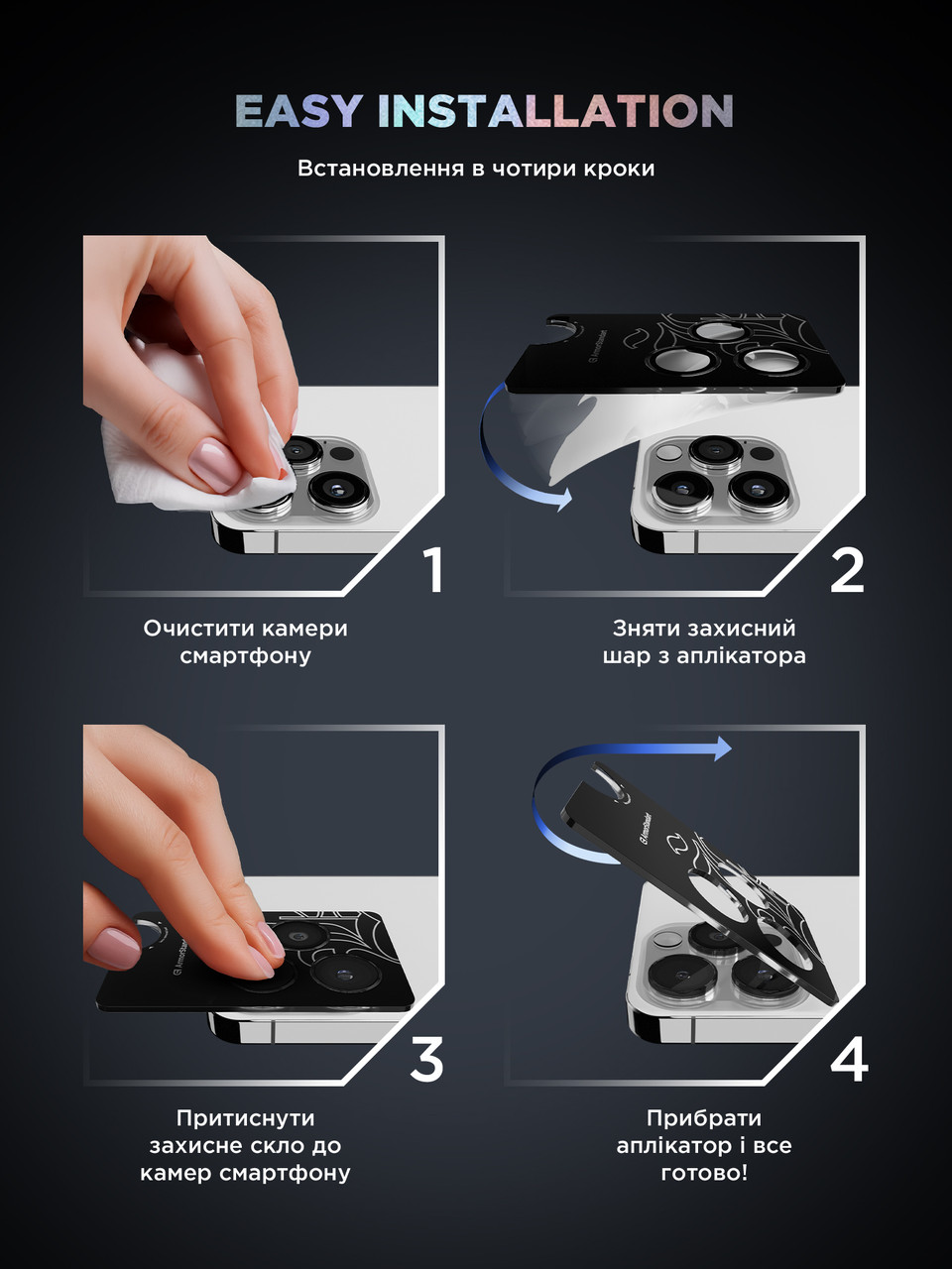 Захист камери від пошкоджень Спеціальне загартоване скло з рівнем твердості 9Н за шкалою Мооса точно враховує розташування та форму лінз камери iPhone та оберігає їх від тріщин, подряпин, пошкоджень...