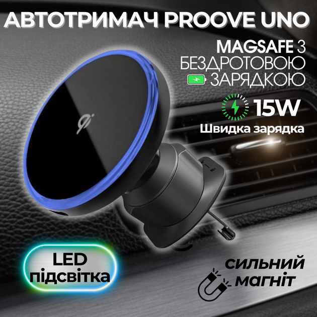 Магнітний Тримач для Телефону в Машину з Бездротовою Зарядкою Magsafe Proove UNO з LED на Дефлектор Підставка для телефона в