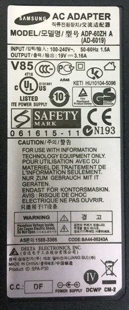 Адаптер для ноутбука Samsung 19V 3.16A (60W) штекер 5.5x3.0мм Delta Electronics