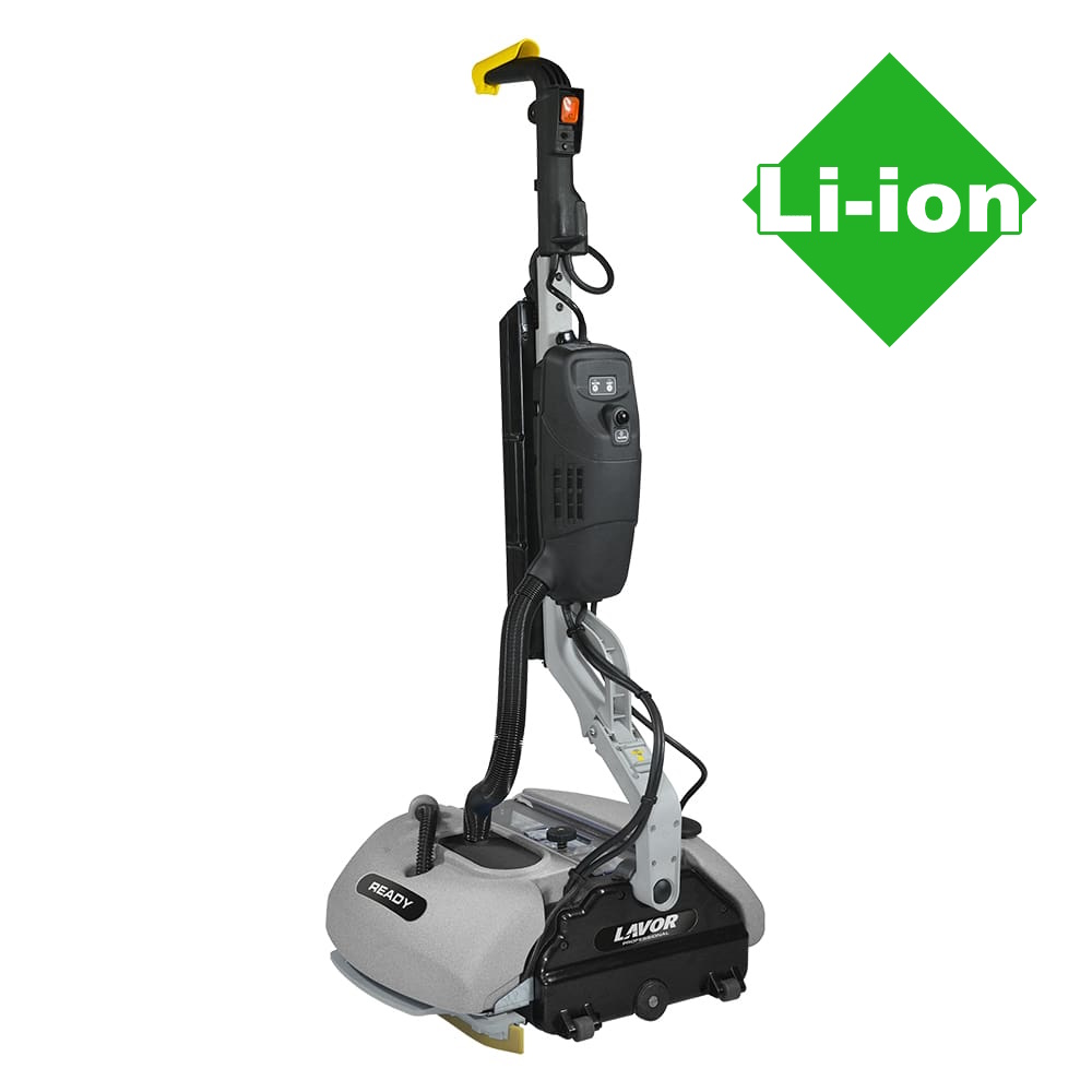 Lavor Ready 32B - це маленька підлогомиюча машина з літій-іонною батареєю. Вага становить всього 15 кг, а рівень шуму не перевищує 70 дБ. Не потребує обслуговування і змащування деталей. Подвійні циліндричні щітки, які протилежно обертаються забезпечують до 40% більшу ефективність очищення за один прохід, що значно підвищує продуктивність. Машина оснащена ручкою безпеки для миттєвого