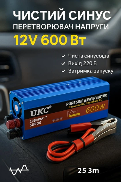 Перетворювач напруги UKC 12V 600W з чистим синусом, захистом від перевантаження та охолодженням вентилятором