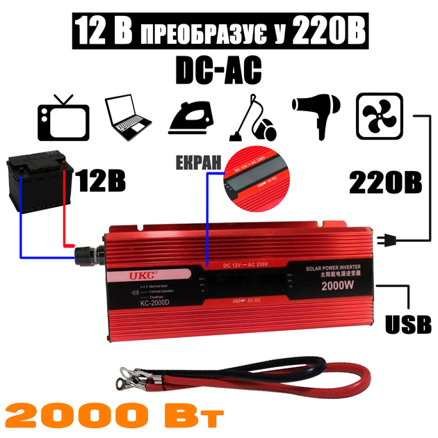 Перетворювач напруги DC12V-AC 220V UKC Solar Power Inverter 2000ВТ інвертор в машину USB, кулер, дисплей Червоний