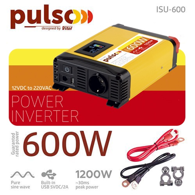 Перетворювач напруги (інвертор) Pulso ISU-600 12V-220V/600W/LCD/USB-5VDC2.0A/прав.синус/клемі