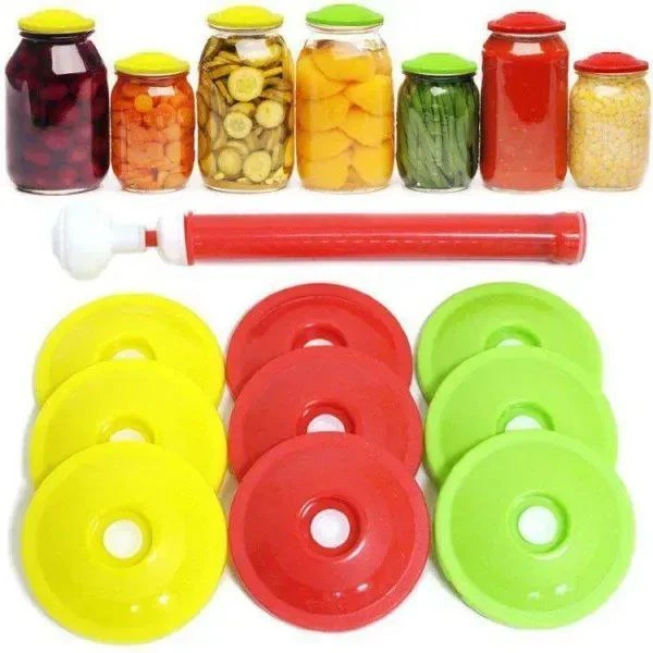 Вакуумні кришки для консервації 9шт + насос / Набір вакуумних кришок для банок / Ручна вакуумна система