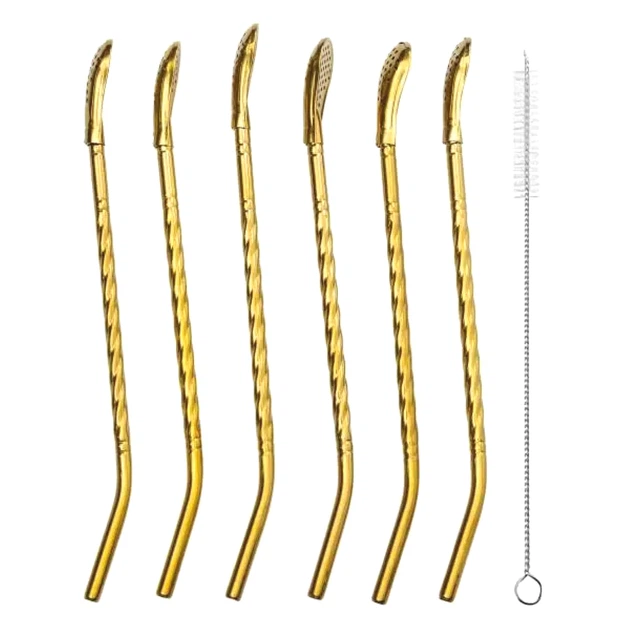 Набір багаторазових ложок-трубочок 6 шт для напоїв 19.5 см зі щіткою для миття з нержавіючої сталі Бронзовий HP-20-55
