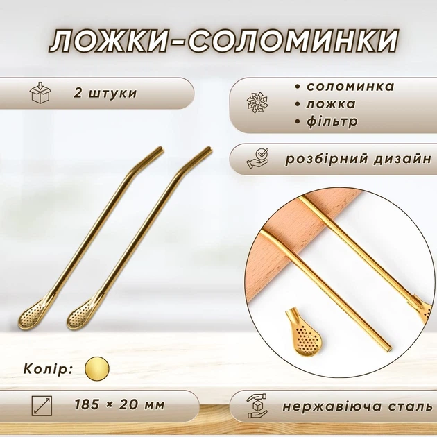 Металеві ложки-соломинки StrawSpoon 3 в 1, 2 штуки, золотисті