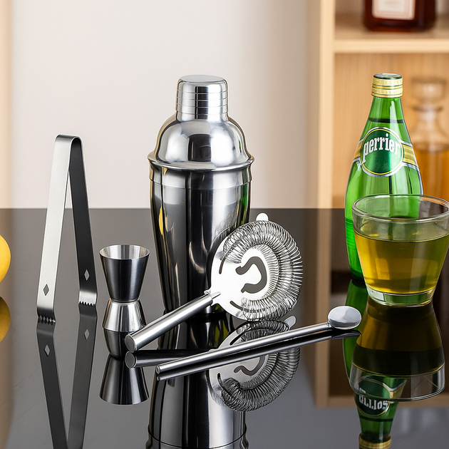 Набір бармена для коктейлів 5 в 1 з нержавіючої сталі — шейкер 750мл, стрейнер, мірна чарка, ложка, щипці