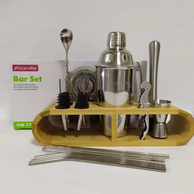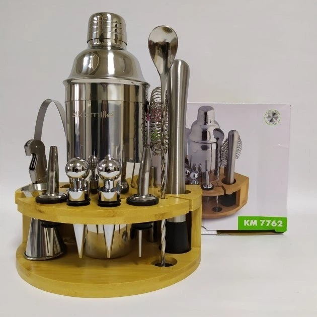 Набір бармена для приготування коктейлів Cobbler 750 мл з дерев'яною підставкою 12 в 1 + каміння для коктелів 9 шт