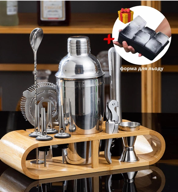 Набір бармена для приготування коктейлів Cobbler 750 мл з дерев'яною підставкою 12 в 1 + Форма для льда на 6 сот