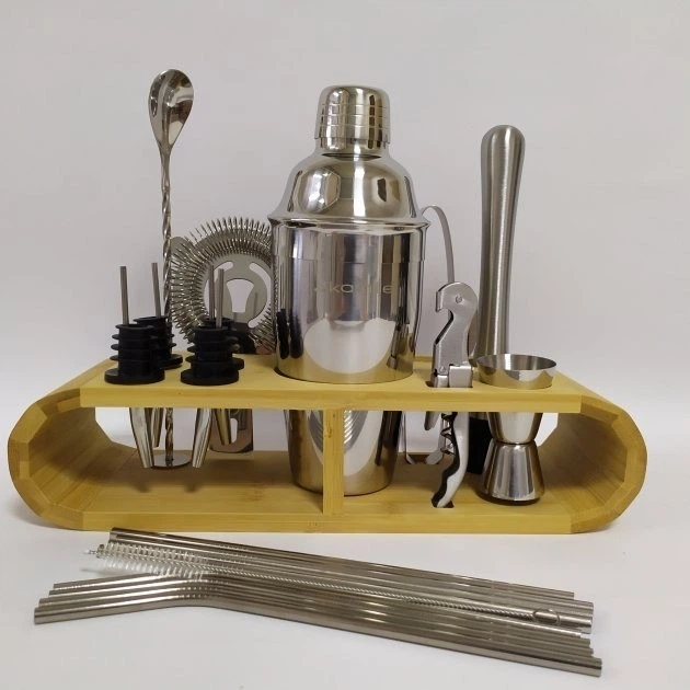 Професійний набір комплект бармена з дерев'яною підставкою шейкером для створення коктейлів 17 елементів (481625-Prob)