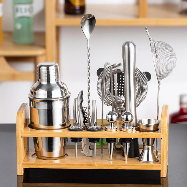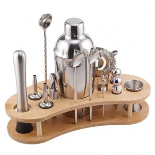 Набір барних аксесуарів для коктейлів, шейкер 550 мл, 16 предметів, нержавіюча сталь, дерев'яна підставка