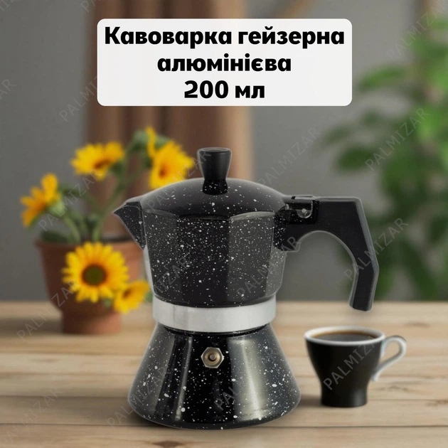 Кавоварка гейзерна 200 мл з харчового алюмінію, діаметр дна 8.5 см, висота 15 см, чорний граніт