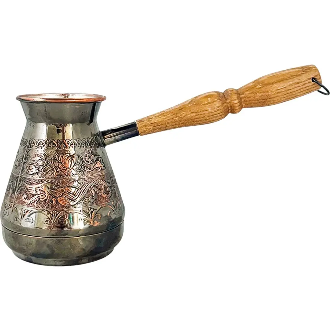 Об'єм: 600 мл, матеріал турки - мідь, матеріал ручки - дерево, висота: 110 мм, діаметр горлечка 55 мм, діаметр дна 80 мм, товщина стінок 1.2 мм