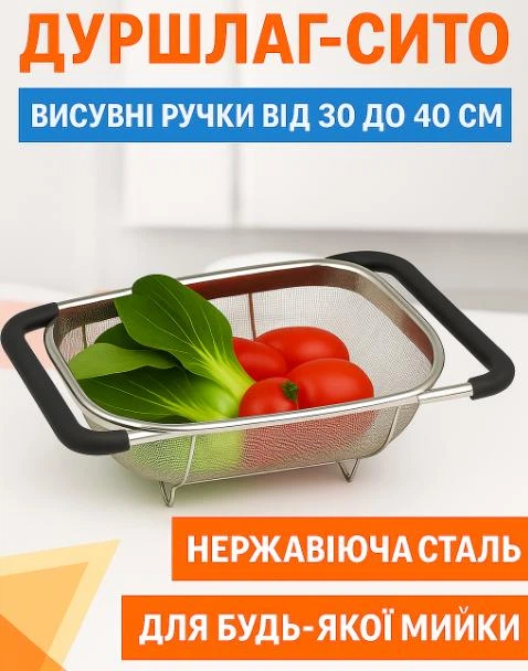 Друшляк-сито на раковину для миття овочів та фруктів 36х25х10.5 см, з нержавіючої сталі, Кухонний аксесуар