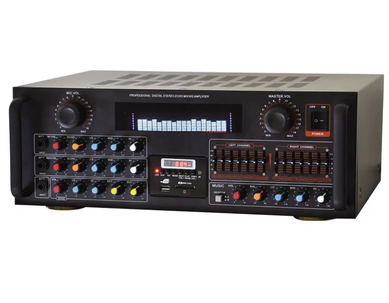 Усилитель стереофонический Встроенный FM тюнер,USB МР3 плеер Входы- 3mono+1stereo Мощность: 2*200W (4?) Частотный диапазон: 20Hz-20KHz Эквалайзер: 3-х полосый в каждом канале Понижающий Пассивный Эквалайзер: 2*7 полос (-12/0 Дб) Эффектор:DIGITAL Effector(Delay+Repea