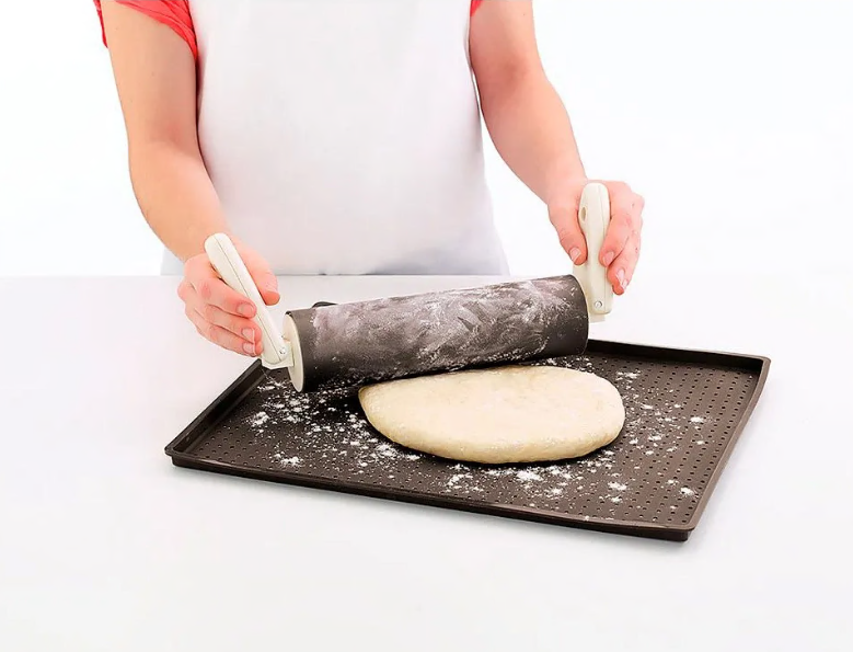 Пластичний антипригарний килимок 40х30 см. Ідеально підходить для випікання основи для піци, фокаччі, пирогів та коржів. Мікроперфорація дозволяє залишити тісто для остигання на килимку, не боячись того, що основа стане вологою та м'якою. Готова основа має хрустку скоринку з усіх боків. Виготовлений із 100% силікону на основі платини. Високоякісний гігієнічний, легкий та стійкий до розриву матеріал. Не містить БФА. Витримує температуру від -60ºС до 220ºС. Підходять для миття в посудомийній машині. Можна використовувати в НВЧ-печі, духовці та холодильнику. Пропонується з рецептом безглютенового хліба. Розмір: висота 1,5см, ширина 40см, глибина 30см