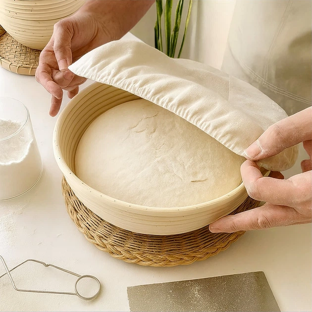 Кошик для вистоювання тіста хліба кругла з натурального ротанга з тканинним чохлом (діаметр 25 см)