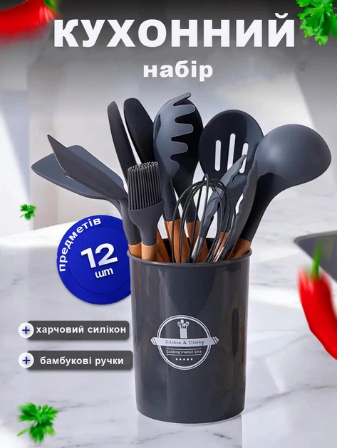 Набір кухонного приладдя Kitchen Set 12 предметів, силіконовий кухонний набір (тримач - дерево)