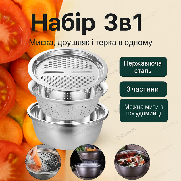 Багатофункціональний кухонний набір 3в1 терка з мискою та дуршлаг нержавіюча сталь для овочів і фруктів