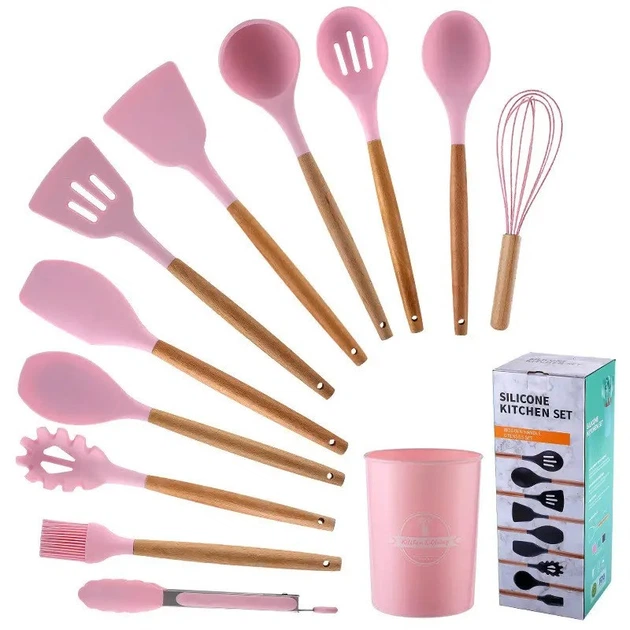Набір кухонного приладдя із силікону та дерева з підставкою Kitchen Set 12 предметів Рожевий (HA-50)