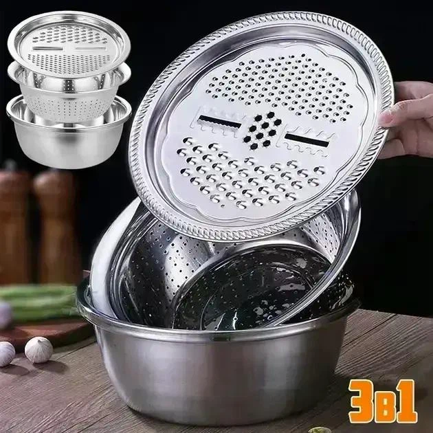 Багатофункціональний кухонний набір 3 в 1 з нержавіючої сталі 23 см | Терка, друшляк, миска для овочів