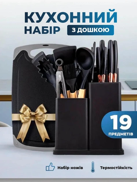 Кухонний набір приладдя, Kitchen Stuff, лопаток, ложек, ножів, 19 предметів, чорний, силіконовий