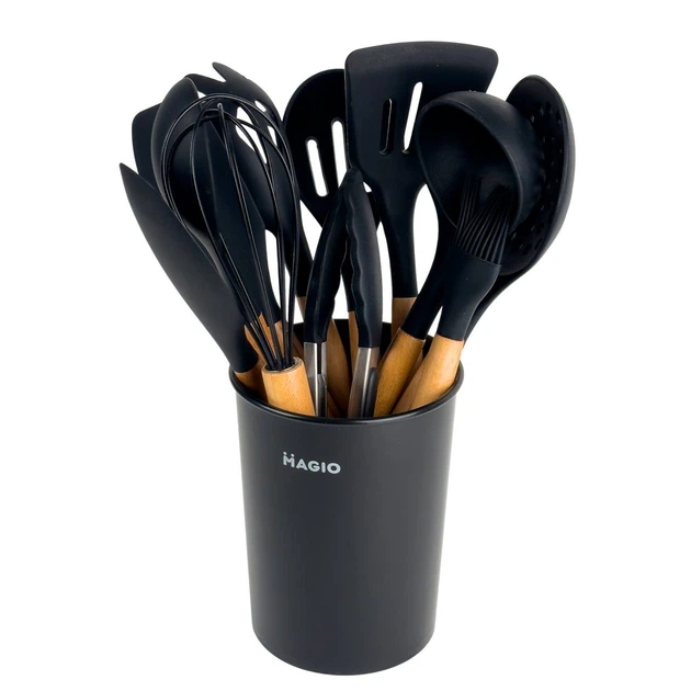 Набір кухонного приладдя із силікону та дерева на 11 предметів з підставкою Magio (Чорний)