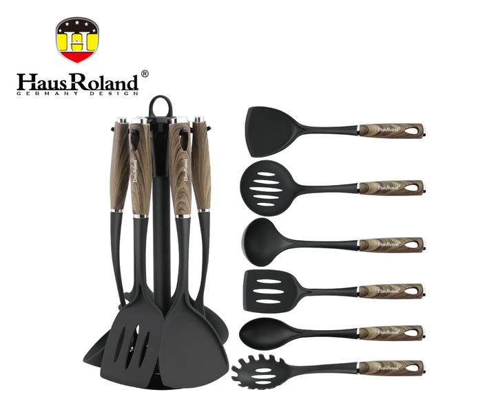 Набір кухонного приладдя Haus Roland HR926-1, 7 предметів із ручками під дерево. Чорний (HR926-1)
