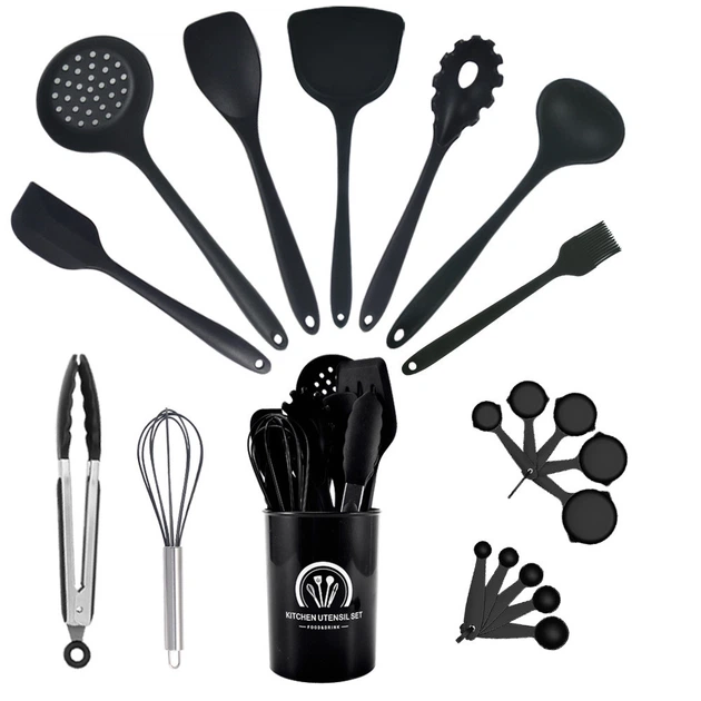 Набір кухонної приналежності, 20 шт., силіконове чорне кухонне приладдя з ручкою з нержавіючої сталі
