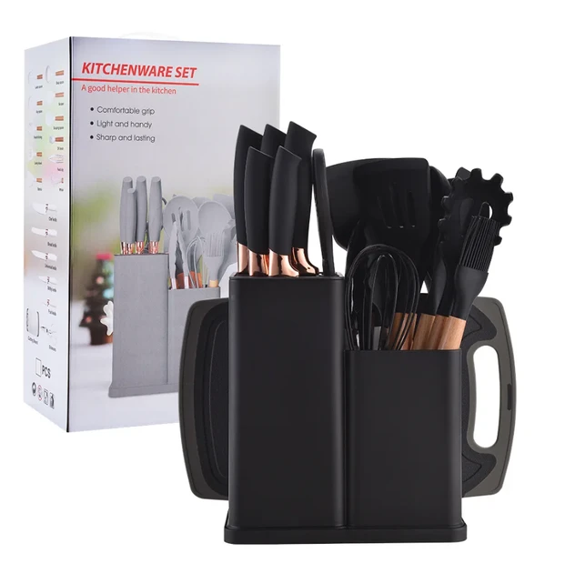 Набір кухонного приладдя Чорний 19 предметів з подвійною підставкою дошкою набором ножів (NNYT19-AV)
