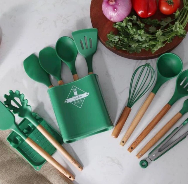 Силіконовий кухонний набір аксесуарів з дерев'яною ручкою ZP 053 13 предметів зелений